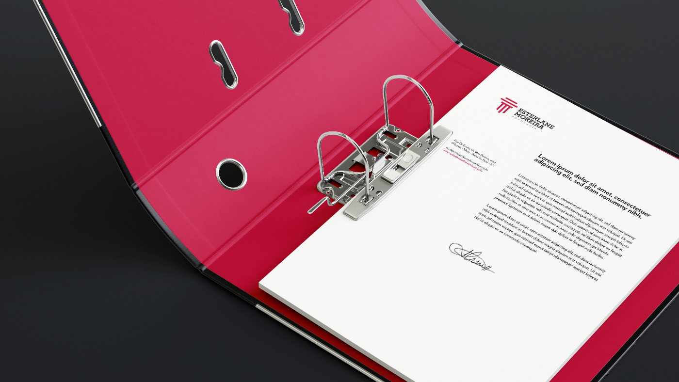 Utilizamos como elementos básicos de comunicação do símbolo as iniciais da Marca, reforçando o nome da advogada, em conjunto com o pilar grego, trazendo solidez ao logo e representado o início da justiça e democracia no mundo. Com o objetivo de trazer mais personalidade para a Identidade Visual, fomos atrás do brasão da família Moreira para definir as cores da marca, identificando dessa maneira a cor vermelha que em adição ao uso do preto trouxe maior sofisticação para toda a Marca.